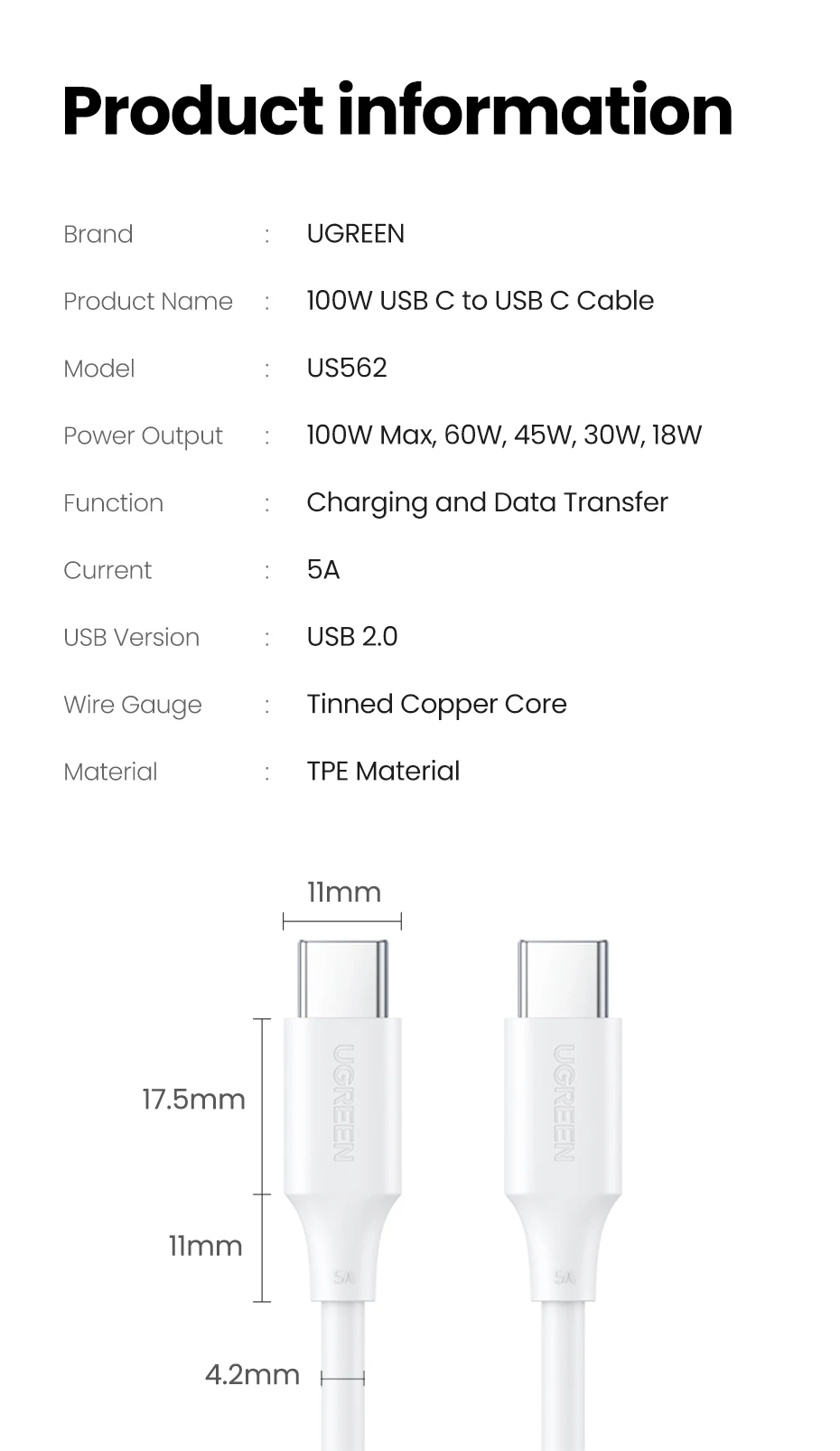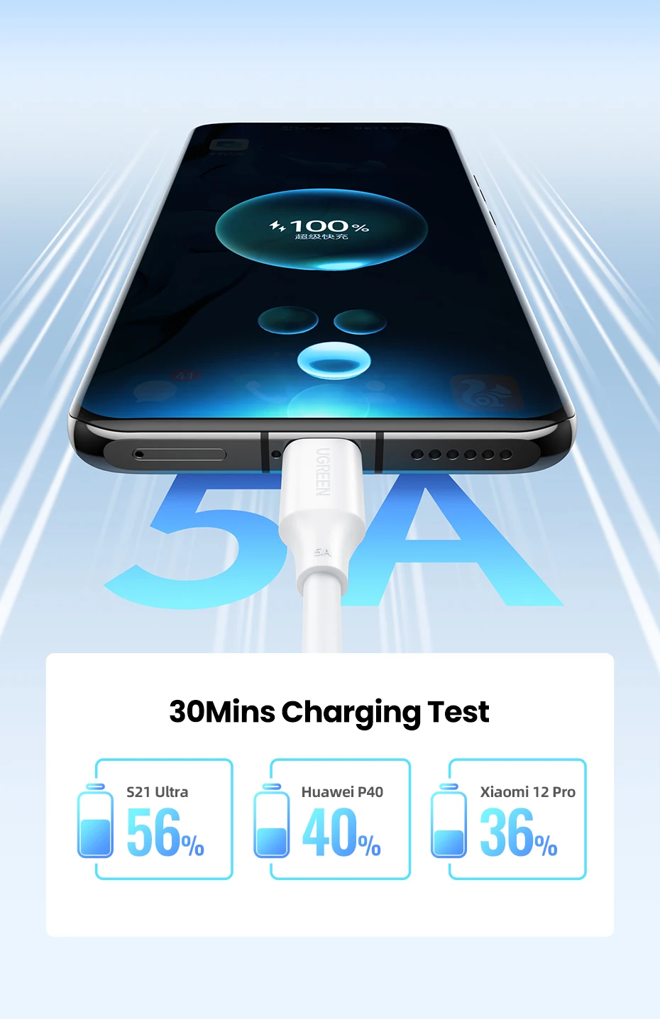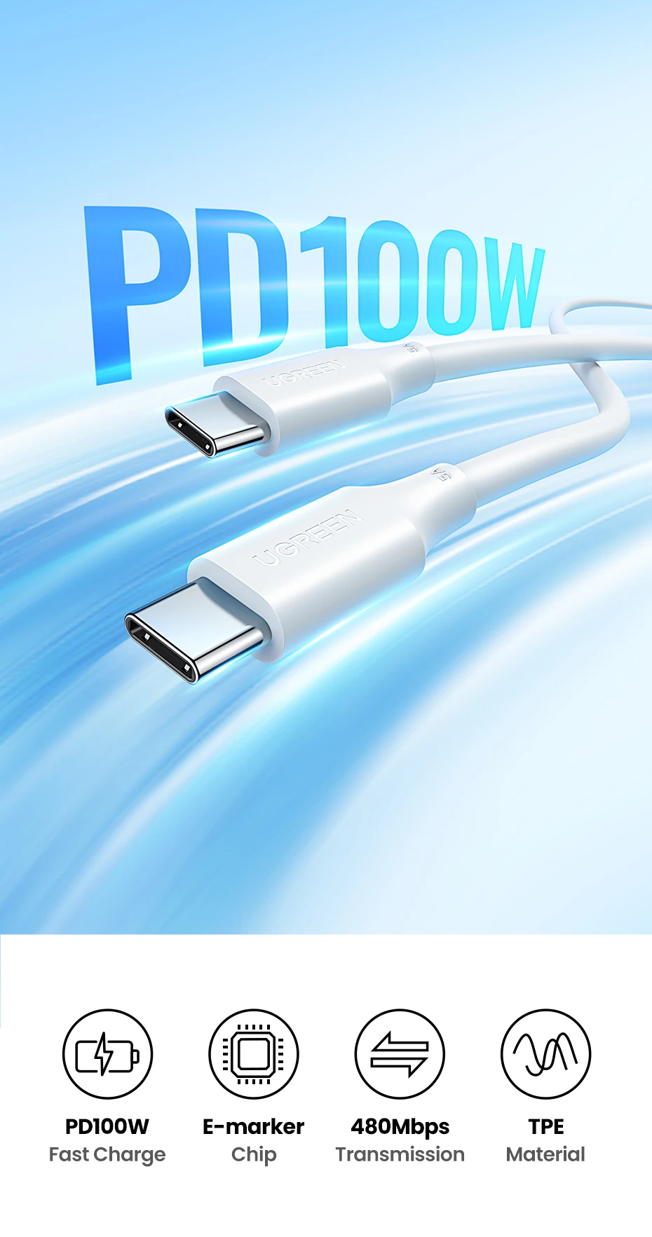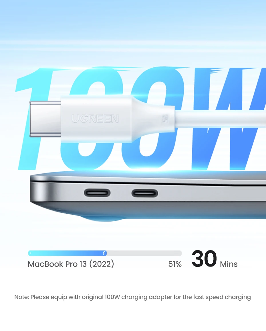 Optimize your charging with Ugreen's 100W USB C Cable, perfect for MacBook Pro and Samsung Galaxy A52s. Its built-in E-marker chip and 5A current offer speedy and efficient charging.