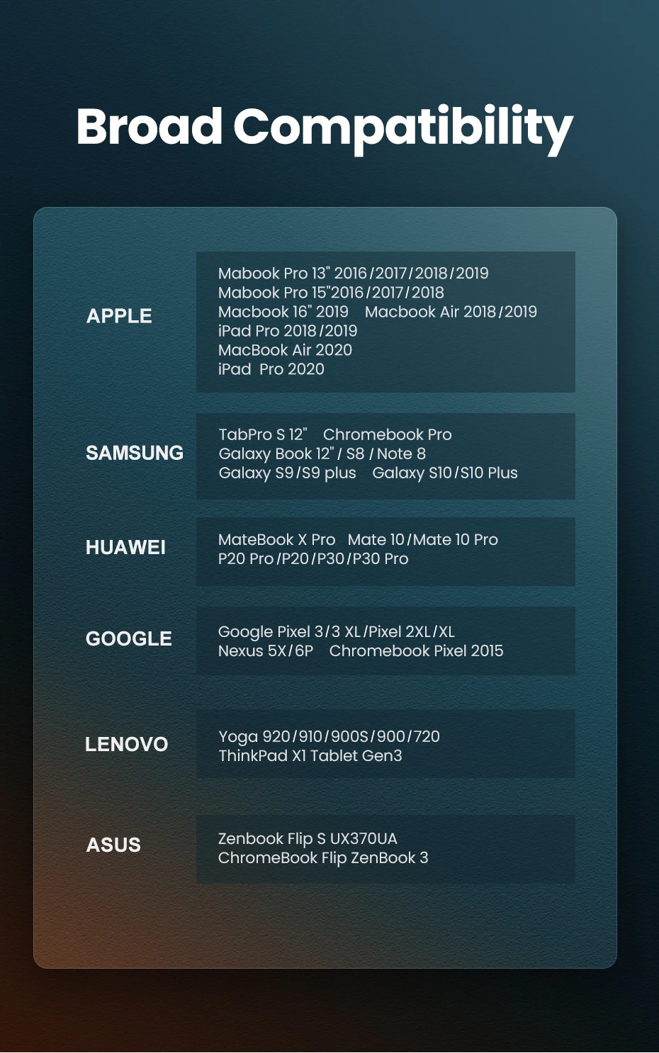 • Ideal for Samsung smartphones, MacBooks, iPad Pros, and other USB-C devices