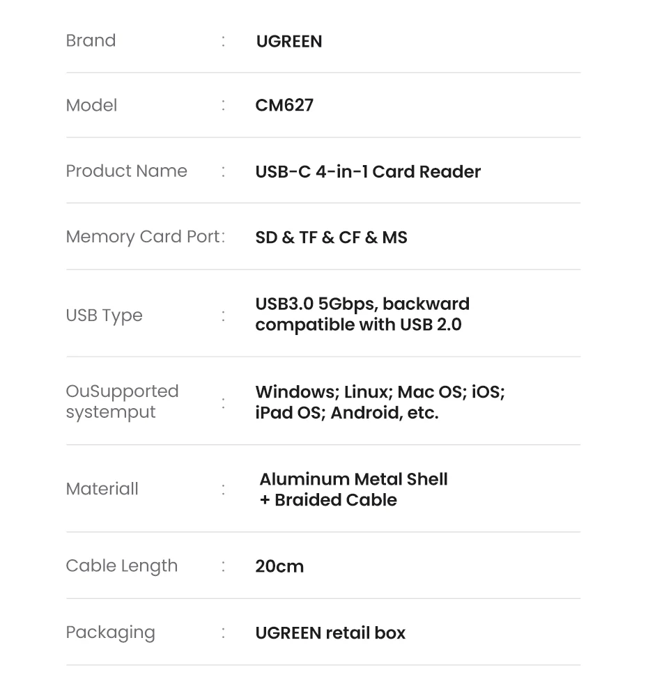 Enhance your data management with Ugreen's 4-in-1 USB3.0 Card Reader. Featuring USB-C connectivity, it supports SD, TF, CF, and MS memory cards, making it ideal for laptops, PCs, and Mac OS with Micro SD OTG compatibility.