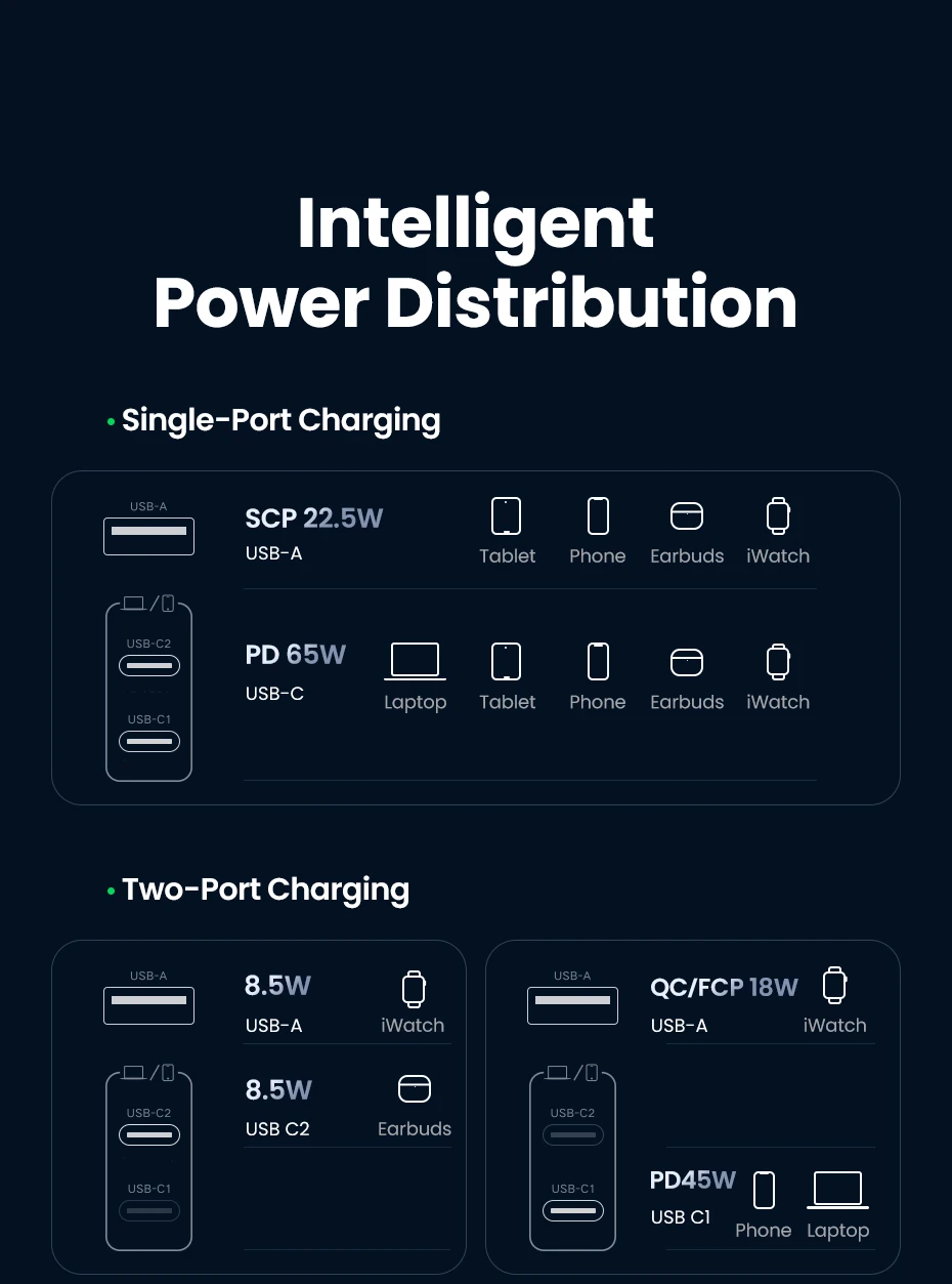 - 1 USB port and 2 Type C ports to charge multiple devices simultaneously