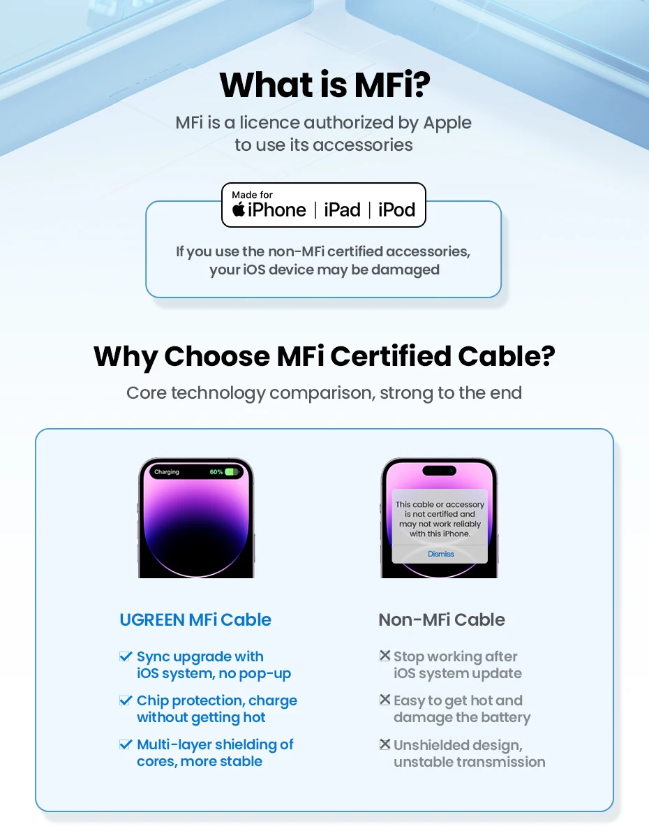 MFi is a license authorized by Apple to use its accessories, it is the abbreviation of "Made for iPhone/iPod/iPad