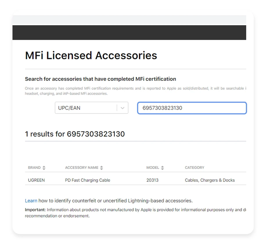 PPID from MFi Authority: 209693-546180, also you can check MFi certified information through this lightning cable's UPC/EAN number: 6957303823130/6957303823048