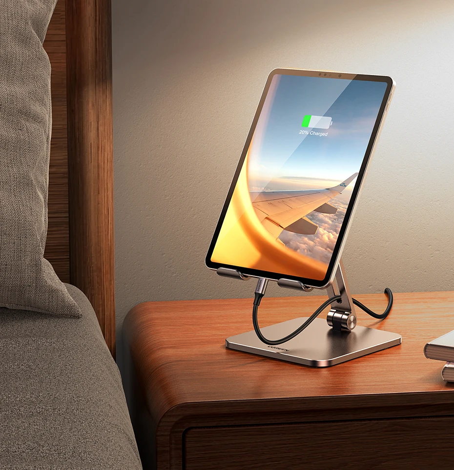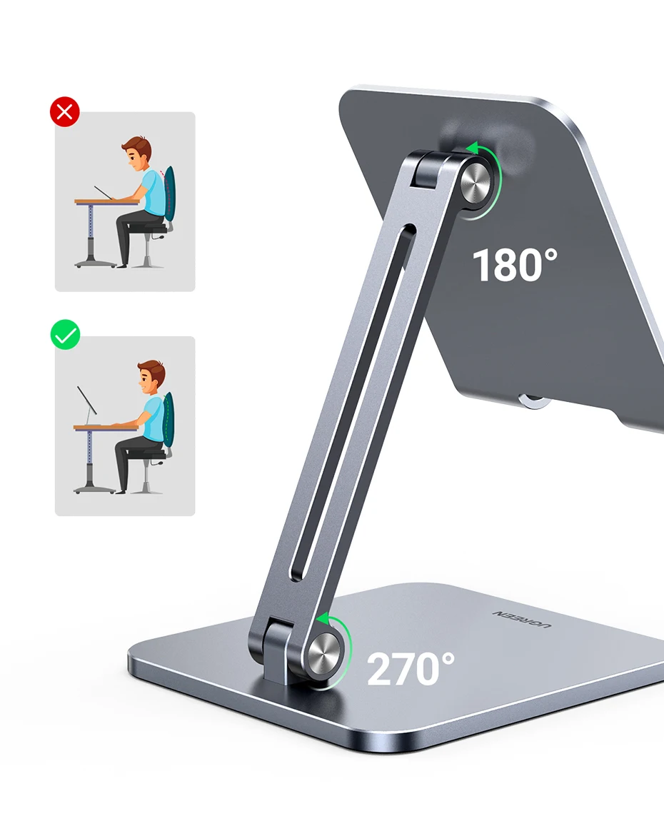 Elevate your device experience with Ugreen's Tablet and Phone Stand, crafted from aluminum. This adjustable stand is perfect for iPad Pro, iPhone, Xiaomi, and various tablets, offering sturdy support and optimal viewing angles.