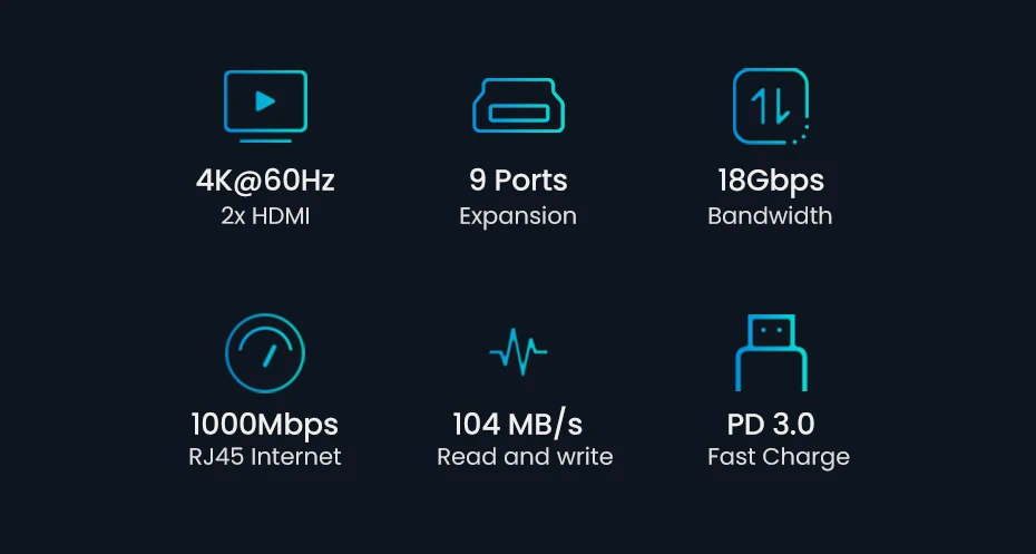 All functions expansion: RJ45 / 2*HDMI 4K60H / PD / SD / TF / 2*USB3.0 / USB2.0