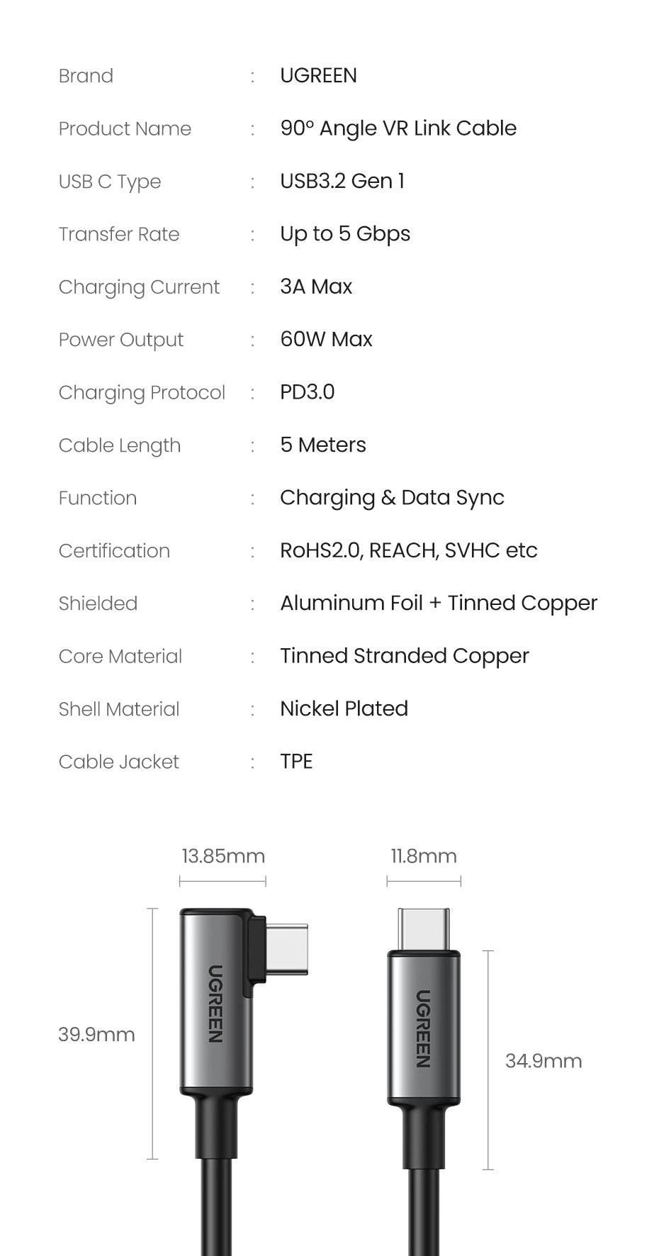 *USB3.2 Gen 1 * For VR Headsets *5 Gbps Transfer Rate *90° Right Angle *3A Max