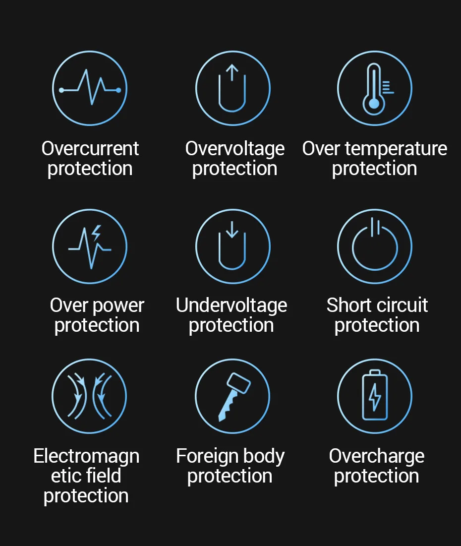*Electromagnetic field protection *Foreign body protection *Overcharge protection