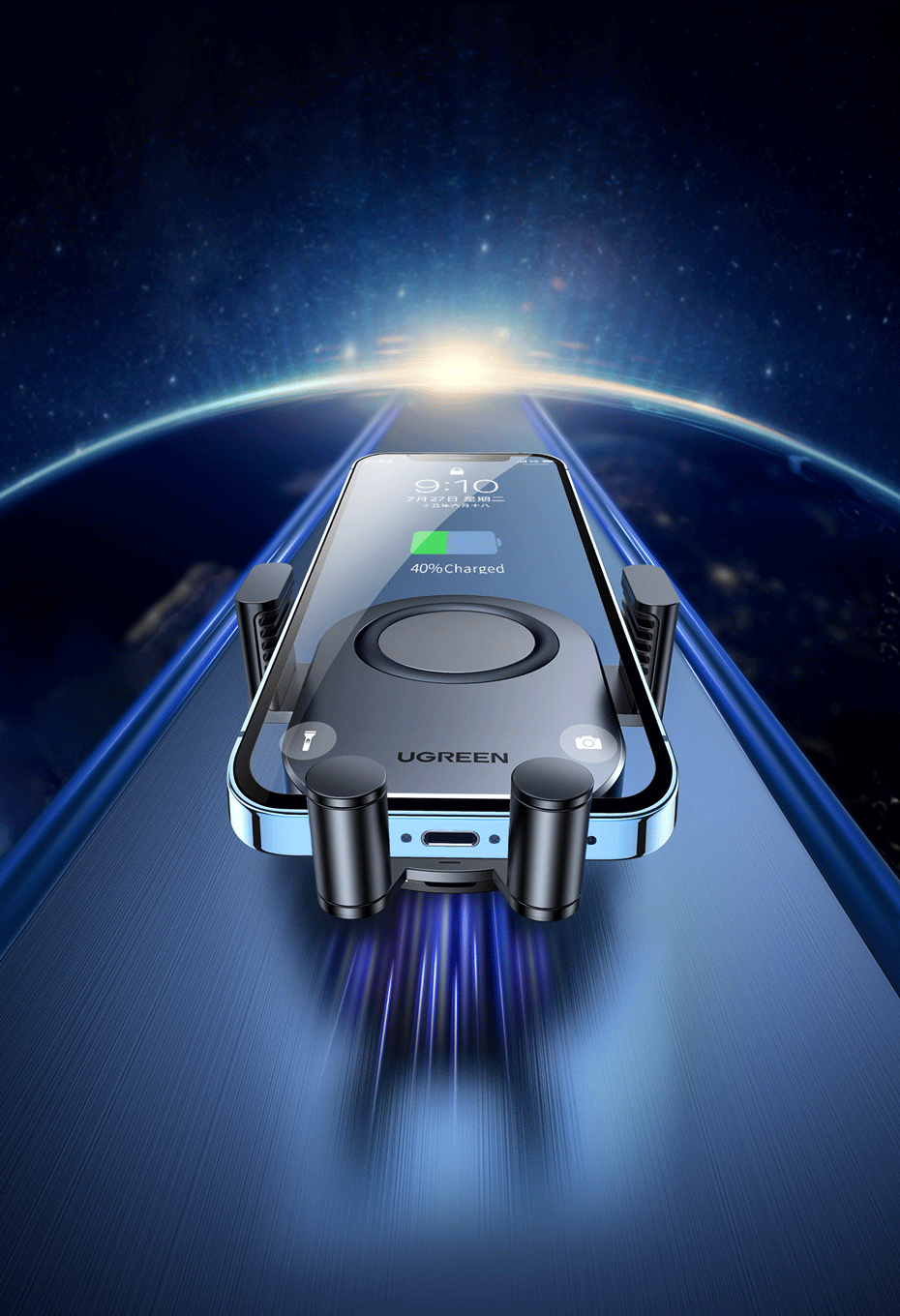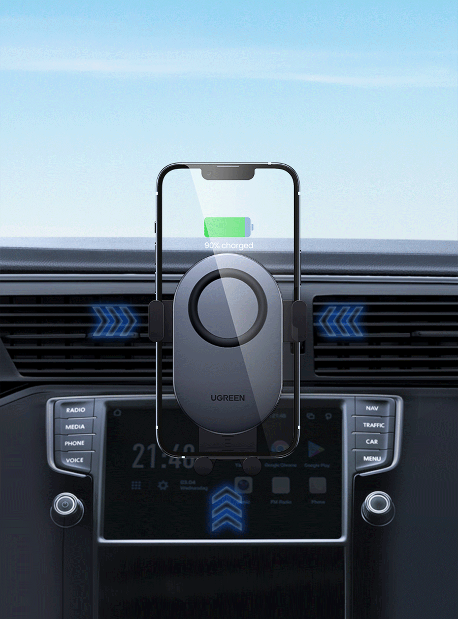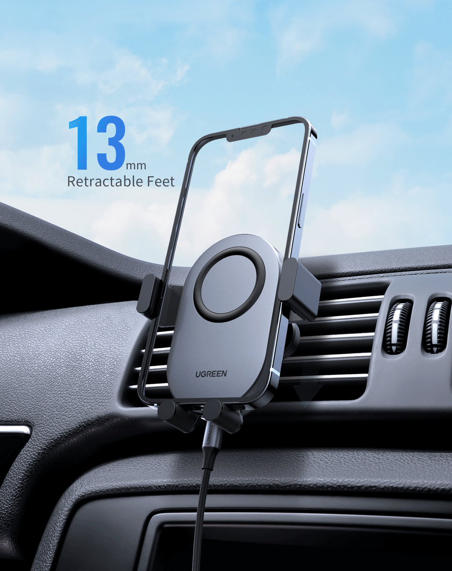 Charge your phone effortlessly with the Ugreen Wireless Charger Car Phone Holder. This 15W Qi wireless charger features an automatic sensor for easy use and fits securely in your car's air vent.